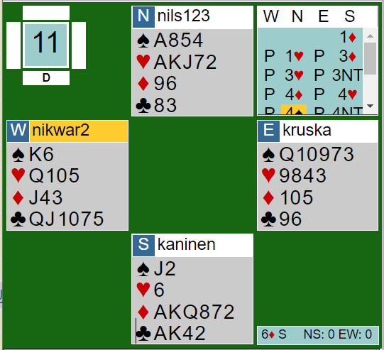 Da nord ikke visste det klarte de mirakuløst å stoppe i 3 ruter med kort hvor så godt som alle makkerpar i bridgeklubber fra Mandal i sør til Hammerfest i nord ville meldt utgang. Og utgangen stod, så det ble en nokså overraskende 11 IMP’er ut.