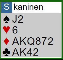 - 3 kløver som de fleste spiller som utgangskrav, og hvor man helst ønsker å ha minst 5-5, men man kan vel ikke få alt man vil her i verden. Er kortene sterke nok til å kreve til utgang med? Kanskje.