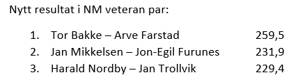 På grunn av en regnskapsfeil i NM Veteran par blir det en endring i medaljerekkefølgen. Nye norgesmestre er Tor Bakke (Bergen AK) – Arve Farstad (TopBridge Oslo). Nye sølvvinnere er Jan Mikkelsen – Jon-Egil Furunes og nye bronsemedaljører er Harald Nordby – Jan Trollvik.