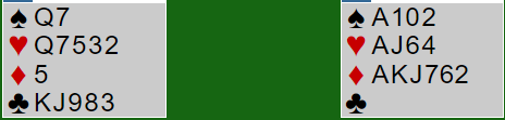 Der er det som du ser to sikre trumftapere og to tapere i hjerter, og det kan ofte være en tredje trumftaper også. Ideelt burde de spilt 2 spar! Eller, når man ser alle kortene kunne de vært i 3NT. Det er ikke lett å finne med 4-4 tilpasning i en majorfarge og en dobbelton på den ene siden, to dobbeltoner på den andre. Men i grandkontrakt er det åtte toppstikk i minorfargene og må bli ett stikk til - det niende - i enten hjerter eller spar.
