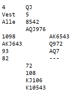 Og det ble et riktig gavespill for oss siden det gikk pass rundt på 4 spar og hele spillet så slik ut:
