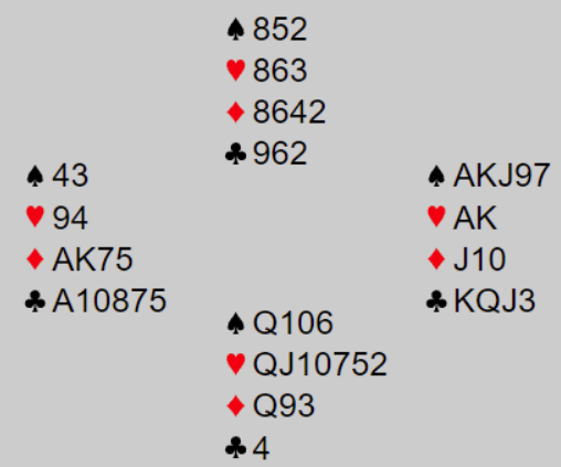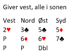 Østs 5 kløver var Exclusion Key Card Blackwood, dvs. han spurte om antall nøkkelkort utenom kløver (fastsetter samtidig hjerter som trumf).
