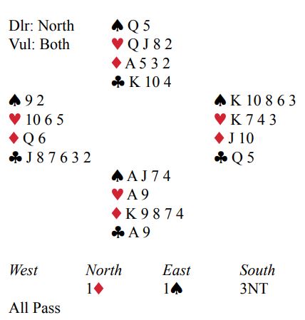 Men 3NT var oppgaven, og vest spilte ut spar 9 til damen, kongen og esset. Ruteren ble testet og det var klart at det var fem stikk i den fargen. Etter to runder ruter ble hjerter dame spilt og vant stikket. Øst kan ikke dekke første honnør, da oppstår det en finesse over vests hjerter 10 som i så fall vil gi ett ekstra hjerterstikk.