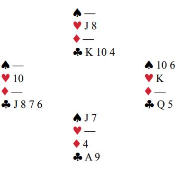 På ruter 4 kastes hjerter 8 fra nord. Nå må øst holde hjerter konge og to spar, hvis ikke blir det stikk for hjerter knekt, eller to sparstikk.