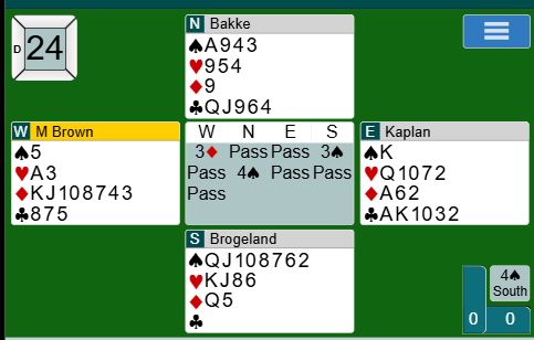 Brown-Kaplan (Ø/V) har normalt en ganske aggressiv sperrestil. Så disse kortene er absolutt noe av det sterkeste åpneren kan ha for 3 ruter. Derfor passet Kaplan (øst). Da meldte Brogeland 3 spar som Bakke løftet til 4 spar.