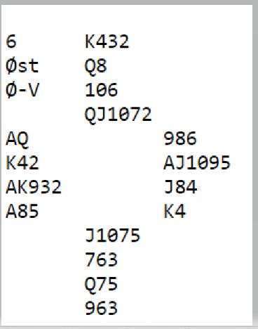Forklaring: vi bruker overføringssvar på 1 kløver, og det var borte for meg et øyeblikk. Jeg hadde altså ikke vist firekorts hjerter, men firekorts spar og renons i hjerter!