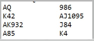 Det er en ganske hardmeldt men sjanserik slem. Det er bare ti toppstikk (2+2+1+5=10), men muligheter i begge de røde fargene. Sånn som det sitter ordner det seg på flere måter, og da hjerteren etter hvert kommer i spill blir det greit å vinne slemmen siden hjerteren sitter veldig snilt med damen i saks og 3-3 fordeling i mot.