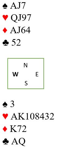 Syd åpnet med 1 hjerter og hørte 1 spar fra vest. Nord hoppet til 3 hjerter som var definert som sperrebetont, men med noen verdier (ca. 4-5 til 8 poeng) med minst firekorts trumfstøtte. Syd løftet til utgangen 4 hjerter. Fra vest kom spar dame i utspill. Spilleplan?
