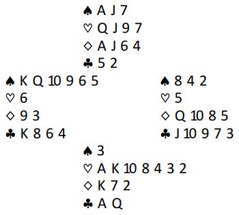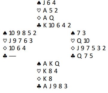 Utspillet vinnes. Så en runde trumf fulgt av at spar 7 trumfes. Så tas for ruter konge og ruter til esset. Nå kommer det vakre sluttspillet, spar knekt spilles med avkast syds ruter 7 idet dette er de gjenværende kortene: