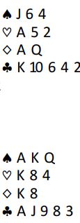 Øst åpner for de fleste med 1NT. Så spørs det hva slags metoder man har med begge minor og sterke kort på svarhånden etter grandåpning fra makkeren. Noen bruker 3 ruter for å vise minst 5-4 i minor og som oftest sleminteresse, eller veldig skjev fordeling. Da får grandåpneren vist preferanse for minorfarge hvis han har fire eller flere kort i en minorfarge. Da bør de kunne finne kløverfargen som trumf i meldingene videre. Men er det sikkert det bør spilles kløverkontrakt?
