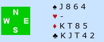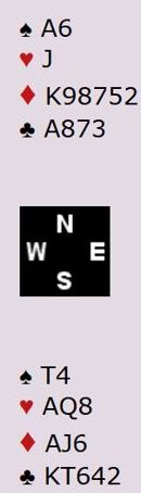 Etter østs dobling med nokså tynne blader passet syd, vest sa 4NT som betyr «to steder å spille», i dette tillfellet begge minor da med spar ville han normalt sagt 4 spar. Nord meldte 5 hjerter, pass-pass og det var vest sin tur igjen. Han hadde ingen intensjoner om å gi seg da han nok trodde makkeren hadde mer enn det der, og nå var det sannsynlig makkeren hadde maks en hjerter, trolig renons! Så vest meldte 5NT, nok en gang ba han makkeren melde mellom minorfargene. Øst meldte 6 kløver, og da det kom tilbake til nord doblet han.