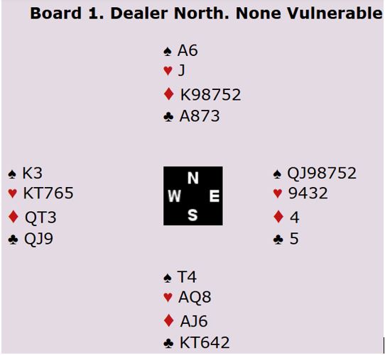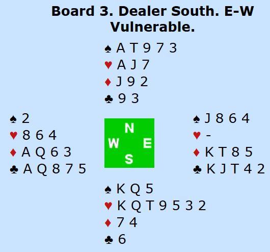 Der Johan Bjørkan og Jørgen L. Nordby (U-21) satt Ø/V meldte det ungarske paret 1NT-2 hjerter overføring, og da syd sa 2 spar passet nord. Det er ikke urimelig, og det meldingsforløpet ble kopiert ved en rekke bord. Men kortene sitter bra sammen som gjør at det er en ganske bra utgang med kun 24 HP til sammen og ikke noe spesiell fordeling. Ø/V har to hjerterstikk og trumfesset. Dermed må minorfargene løses uten taper. Det er to muligheter: enten må kløveren gir fire stikk, eller ruter dame kan sitte i saks. Kløveren forsøkes først av de to vinnersjansene. Da den fargen ordner seg med fire stikk er det ti enkle, en ruter forsvinner hos nord på syds fjerde kløver. Det er dog en fordel av trumfen sitter 3-2, for om den sitter 4-1 kan det bli trøbbel om forsvaret finner hjerterutspill og spiller tre runder hjerter må nord trumfe og ville i så fall hatt samme lengde i trumf som den med for eksempel esset fjerde. Motspillere bør da ligge unna to ganger med esset sitt. Spilles en tredje runde trumf da stikkes med trumfesset fulgt av en fjerde hjerter som fører til at den som eventuelt har fire trumf i mot får ett trumfstikk til for sin fjerde trumf.