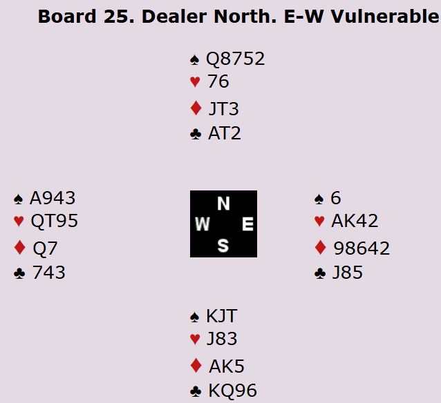 Omtrent halvparten av parene vant 3NT, resten gikk bet i 5 i minor, og noen få gikk (flere) bet i 3NT da de glemte å lasjere i første runde spar.