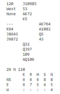 Da Lindqvist åpnet med østs kort var de ganske raskt i 6 spar som er en glimrende kontrakt. Den er kun avhengig av at trumfen sitter 3-2, en 68% sjanse. Men spar satt skjevt, for sikkerhets skyld 5-0. Uheldig, men ofte uavgjort spill. Ved det andre bordet doblet imidlerti N/S 4 spar som ble vunnet med ti stikk, 590 og 12 IMP til lag NAMBAWAN.