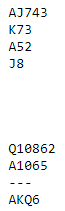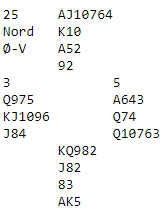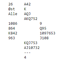 Som N/S sine kort er har ikke N/S mer enn tolv toppstikk, og det trettende må komme ved at kløveren eller hjerteren gir ett ekstra. Kløver kan sitte 3-3, hjerter dame kan sitte dobbel, men det er også flere sjanser om det ikke kommer kløver ut. Hvis det spilles ut kløver brytes nemlig forbindelsen som er nødvendig for en eventuell skvis. Beholdes den forbindelsen kan det bli skvis i kløver-ruter, kløver-hjerter, eller en tosidig skvis om kløveren altså sitter 4-2 eller 5-1. Men i praksis var det ingen problemer, kløveren satt fordelt 3-3, og de som satset på 7 grand kunne notere +2220. Det var delt topp mellom to par, fire par meldte 7 spar som ble vunnet, to par var i lilleslem, ett par må vel ha hatt en misforståelse da de stoppet i utgang, og ett par gikk bet i 7 spar.
