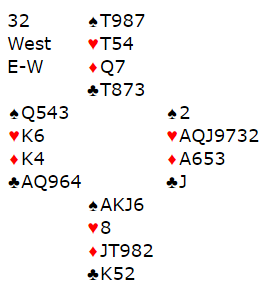 Los Escandinavos sitt Ø/V-par spilte 4 hjerter og vant elleve stikk. Lederlagets Ø/V meldte 6 hjerter etter at vest hadde åpnet med 1 grand. Vest ble spillefører etter overføring. Lie spilte ut spar 10 til syds konge. Nå spilte Myrvold ruter 9! Det så for meg i første omgang ut til å være et lurt spill for å lage et feilaktig bilde av rutersitsen. Og spillefører tråkket feil, han valgte en spilleplan som i utgangspunktet er bra; stjele en ruter lavt og håpe fargen sitter 4-3, og så stjele den siste ruteren med hjerter konge. Men da kunne Lie trumfe over i tredje ruterrunde - en bet.