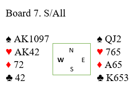 Etter kløver ut til stjeling og tre runder trumf (syd har kun to trumf nå) spilles spar ess og mer spar. Vest vinner og spiller mer kløver som syd trumfer og har da kun en trumf igjen! Hvis sparfargen satt 3-2 ville det vært greit, ett sparstikk til ville blitt gitt bort og syds hånd ville vært godspilt, elleve stikk som alle andre.