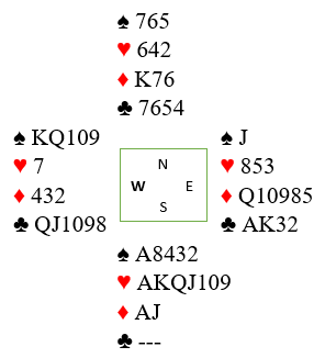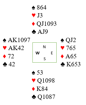 Utgangen er ofte nedlegg, og ikke sjelden vil du få elleve stikk med disse N/S kortene etter å ha tapt kun to sparstikk. Men hvis du ser for deg en litt skjev sits, for eksempel 4-1 i spar, og 3-1 i trumf, er det ikke så lett. La oss si det sitter slik fra start: