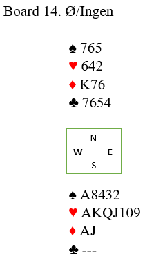 Vi startet med å poengtere at øst har en flat hånd. Støttehender har jo ideelt en kort farge (stjeleverdi). Pussig nok er det i dette tilfellet en stjeleverdi hos øst som har 4-3-3-3 fordeling!