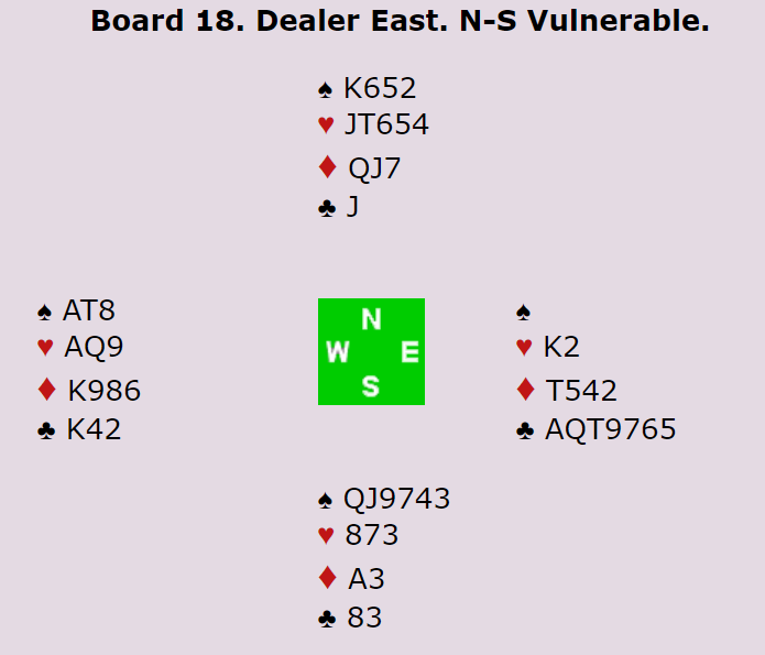 Noen få par til var nok et øyeblikk i 7 hjerter, men N/S stampet i 7 spar og gikk 1700 i bet. Å få inn +1700 ga 91 % til Ø/V.