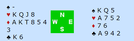 Som du kan se er ikke ruterslem bra i det hele tatt da det med den fargen må bli minst to rutertapere. Men over Gunn Tove sin 5NT foreslo Thor Erik 6 kløver som ble kontrakten. I kløverkontrakt gir majorstikkene avkast for to rutere, så med to små mot kongen fjerde i ruter står slemmen fordi ruter ess stter foran kongen (og at det ikke er noen ruterstjeling fra start).