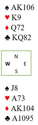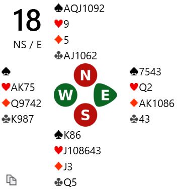 Heiberg-Evenstad og Hoftaniska var i 6 ruter spilt av vest! Og kontrakten var for sikkerhets skyld doblet. Hvis det kommer spar, ruter eller hjerter ut er det tricky, men kontrakten kan vinnes da også. Nord spilte imidlertid ut kløver ess som gjorde at det ikke var noen problemer med å vinne tolv stikk, DE BOTTON +1190 og 10 IMP inn!