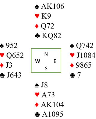 Hvis rett kløverhonnør legges ned kan trumfen løses uten taper. Sitter det 4-1 og feil kløverhonnør spilles er det over. Men selv om rett honnør spilles andre gangen må det mer til. Spillefører må i så fall få tatt en stjeling for å få ett ekstra trumfstikk før trumfinesse tas over knekten fjerde. I så fall er det best å trumfe hjerter hos nord enn å trumfe spar hos syd som medfører større sjanse for overstjeling av vest. Det betyr at den 4-1 sitsen som gjør at hjerterstjeling hos nord kan tas må være fire trumf hos øst. Spillefører la derfor ned kløver dame som antagelig er matematisk rett spilt om en ser på det som må gjøres senere i spillet. Men slik så hele spillet ut: