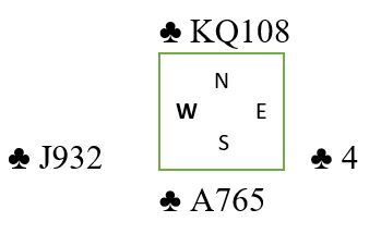 Det spilles liten kløver mot bordet. Om vest legger liten vinnes med kongen, så spilles garantert liten tilbake til syds ess. For det er nå kun en 4-1 sits spillefører kan løse. Om øst har J-9 fjerde har han sikkert stikk uansett. Idet liten spilles fra nord i andre trumfrunde følger ikke øst farge. En markert finesse med tieren tas i fargens tredje runde. Fargen så altså slik ut fra start: