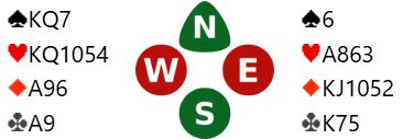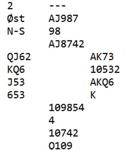 Så du legger liten hjerter fra begge hender i første stikk, kommer inn i tredje stikk etter hjerter ess og en til fra vest. Da spilles spar til knekten og østs konge. Derfra kommer kløver til esset. Så spar til nord og ruter opp mot syds honnører. Øst legger vel liten ruter, og damen vinner det stikket. De tre kløverstikkene tas og en spar forsvinner fra syd. Så mer ruter mot syd. Det vinnes i alt to sparstikk, ett hjerterstikk, to ruterstikk og fire kløverstikk = 9.