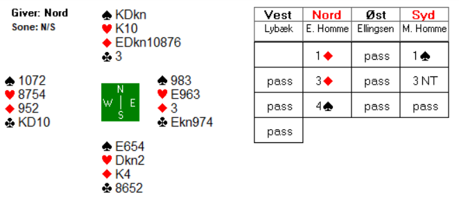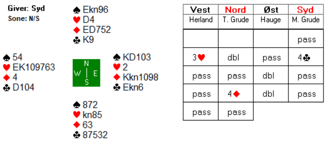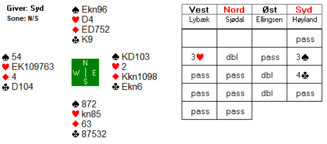 Når nord først har valgt å doble, kan det være et alternativ for syd å passe ut, rett og slett fordi det kan bli det billigste selv om kontrakten skulle stå? Om nord er så sterk at man ikke blir doblet og går mange sonebeit i egen vei, da er det kanskje et håp om at 3 hjerter kan være beit også? Eller blir dette kun etterpåklokskap? Uansett var det et interessant spill som også førte til et par latterkuler under sammenligninga lørdag kveld.