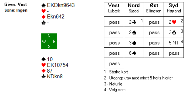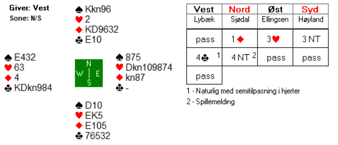 Det var kun ved to av bordene at øst-vest kom med i meldingsforløpet, begge steder etter at vest åpnet med svake 2 ruter. Espen Haugstad og Lise Blågestad kunne notere hele 750 på spillet etter følgende meldingsforløp:
