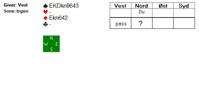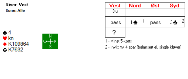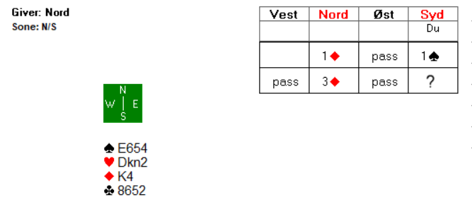 La oss si at du passer. Nord melder så 4 spar i neste melderunde, før det går to passer til deg. Har du krefter til å være med denne gang?