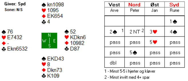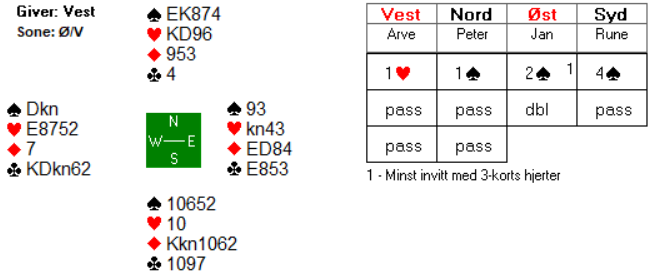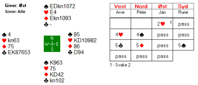 Jeg kan tenke meg at Arve syntes sparfarga var for tynn til å gå inn med 1 spar mot en passet makker, særlig tatt i betraktning at han hadde bare 9 hp også. Men det skulle vise seg at det ikke ble så enkelt å komme med i det hele tatt da han valgte å passe første gang. Det er jo ikke spesielt fristende å gå inn på 2-trinnet i andre melderunde. Nord har riktignok forhåndspasset, men kan jo likevel ha så mye som 10-11 hp. Egentlig er det scenarioet fortsatt mulig i tredje melderunde. 2 kløver fra nord kan jo innebære ei invitthånd av noe slag, men aktuelt var det altså ei svak hånd og ønske om å spille 2 ruter i stedet for 1 grand som var bakgrunnen for 2 kløver.