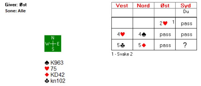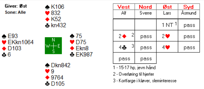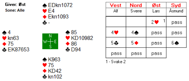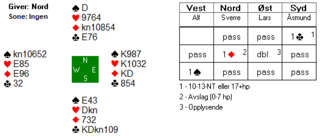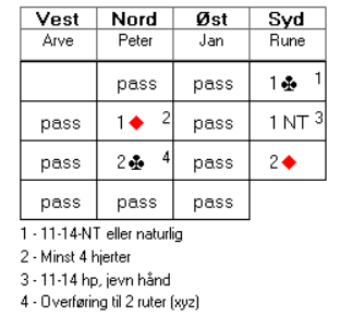 Åsmund fikk vist akkurat hva han hadde, og dermed var det ikke vanskelig for Sverre å lette til utgang. Det var naturlig for Sverre å nøye seg med 2 ruter i andre melderunde da 2 kløver i utgangspunktet er å betrakte som 11-14 hp. Om makker har mer enn det, melder han en gang til over 2 ruter.