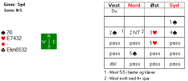 Det er vel liten tvil om at nord må ha relativt sterke kort med minst 5-5 i spar og ruter. Selv har du tilpasning til begge fargene, og praktisk talt alle dine honnørpoeng i makkers farger. Har du tro på at det står slem?