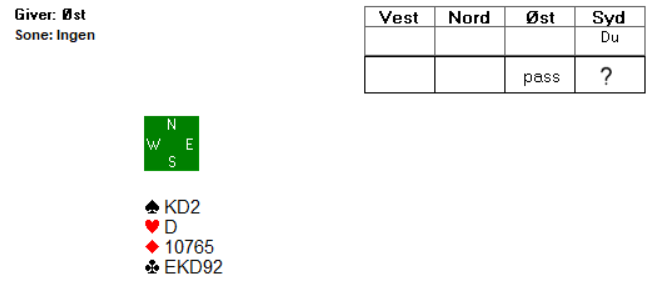 Det som gjør det aktuelt er at du har ei god 5-kortsfarge i kløver. Et sentralt poeng er at du har mellomkortene i kløver. Ei farge med EK987 inneholder like mange honnørpoeng som EK432, men den første farga er likevel betydelig bedre.