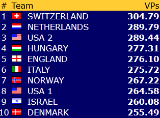 Åpen klasse: Norge - Sveits 7,2 - 12,8 (IMP-score: 32 - 42)