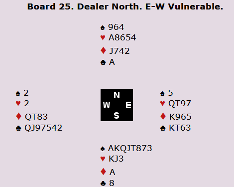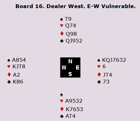 Norge fikk inn en slemsving på dette spillet i kampen mot Sør-Afrika da Christian Bakke og Boye Brogeland meldte 6 ruter, mens det motstanderne ved det andre bordet havnet i 5 grand etter en meldemisforståelse.