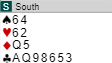 Om syd skal ta vekk bordets siste trumf, går det på bekostning av trumfstikket. Dermed må øst enten få seks trumfstikk på hånda og ei stjeling i bordet, eller eventuelt syv trumfstikk på hånda. Resultatet blir uansett syv stikk og fem beit for scoren 1100 ut. Det tilsvarer 7 IMP i den norske kolonnen når man sammenlikner med 1390 fra det andre bordet.