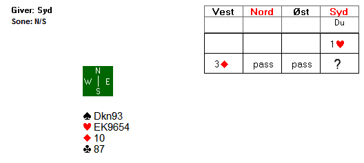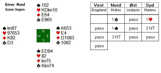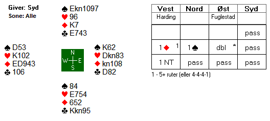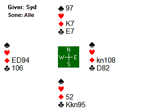 Da Norge fikk kontrakten i nord pekte ruter seg ut om det klart beste utspillet fra øst. Spar er mindre aktuelt fra kongen tynt fjerde siden syd med sin gjentatte søkemelding ofte indikerer firekorts spar.