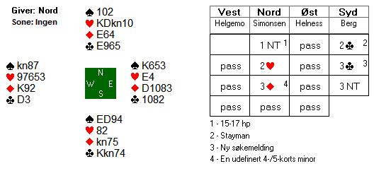 I lukket rom kom Helness og Helgemo i 6 hjerter. I denne kontrakten ble det 12 stikk fordi syd måtte få et trumfstikk.