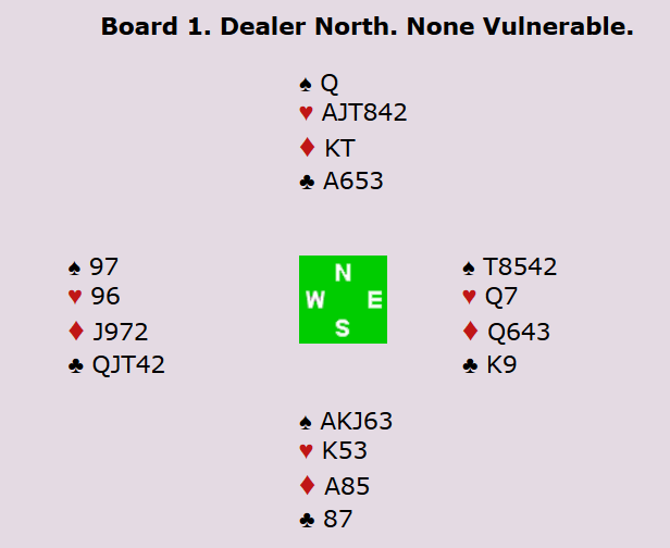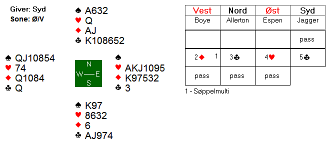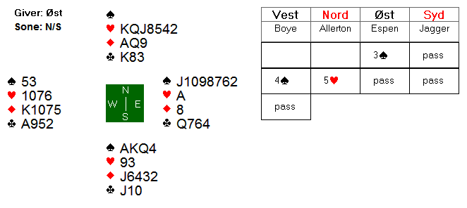 Espen åpnet i 3 spar og Boye satte press ved å løfte til 4 spar. Nord sa 5 hjerter, og var litt uheldig med å finne makker med AKQ i spar.