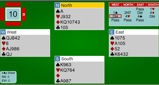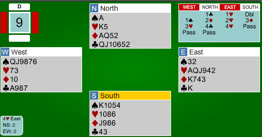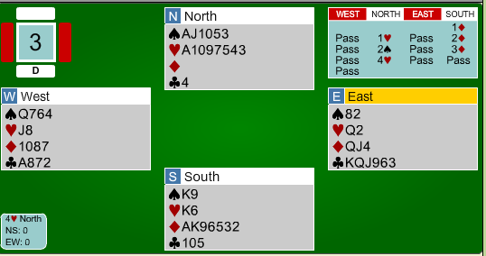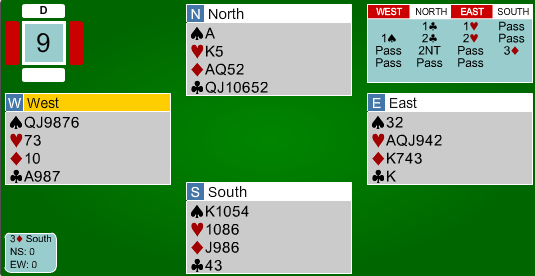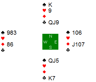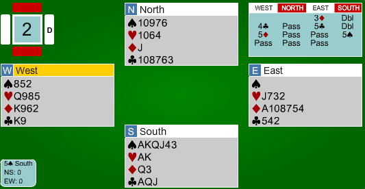 Spillefører prøvde i stedet å hive kløveren sin. På den tredje runde spar kunne vest trumfe, nord trumfet over, men satt igjen med en taper i hjerter, ruter og kløver.