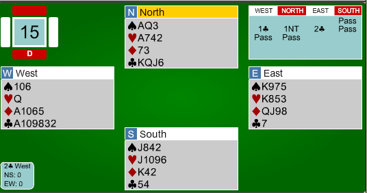 Nord spilte ut kløver ess mot 6 ruter. Ved første øyekast ser det ut som 2 spartapere, men det lurer et innspill mot nord hvis han ikke er våken.