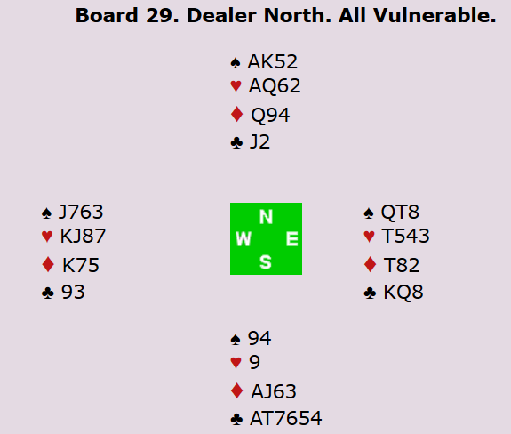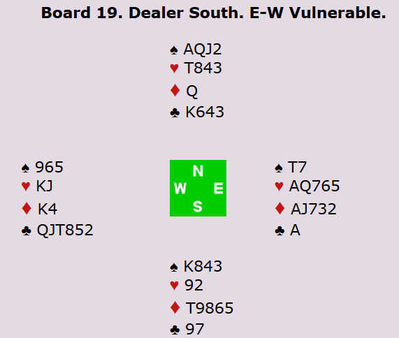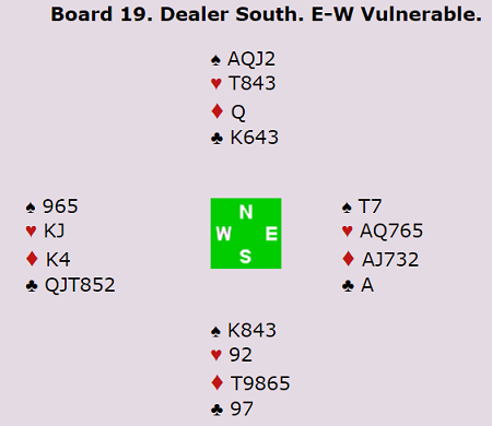 Aggressivt og tøft meldt av de unge og dyktige israelerne Birman og Padon. Sistnevnte startet med spar ut til makkers konge. Han skiftet så til kløver til makker ess, og fikk en ny kløver til stjeling. Et gjennomspill i ruter sørget så for to stikk i den sorten for forsvaret, og øst måtte dessuten få stikk for hjerter konge. To beit og 500 inn for israelerne.