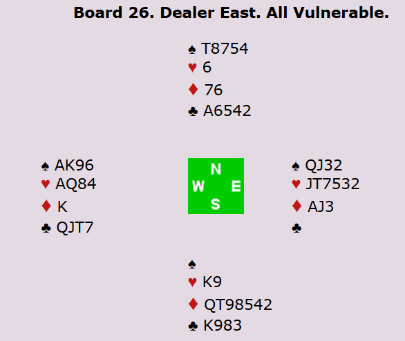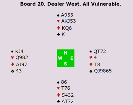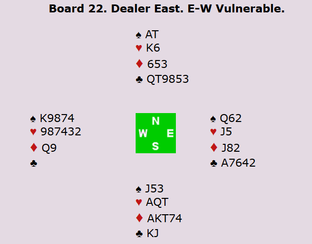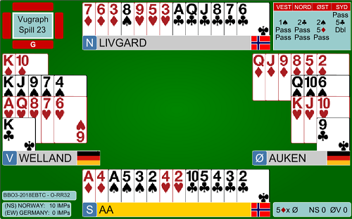 Terje doblet i syd med renons i spar, men da kom blålappen fra Welland i vest. Nord spilte ut kløver ess, og da kunne spillefører tatt 13 stikk med hjerterfinessen, men Welland valgte forståelig nok å safe sine 12 stikk. 6 hjerter xx ga Tyskland scoren 2070 og 12 IMP mot 1430 på andre bordet.