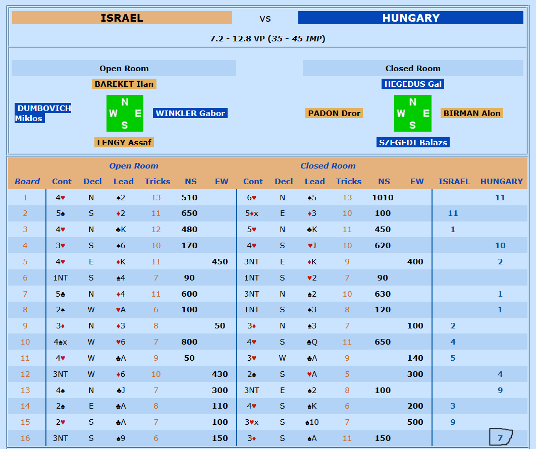 Siste nytt fra Israels kamp var jo at Ungarn ledet med 15 IMP før de tre siste spillene. Så det så jo foreløpig lyst ut. Men det var over hodet ikke avgjort.