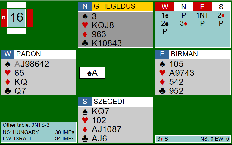 Mens isralerne hadde gått tre beit i 3 grand, på samme måte som italienerne mot Norge, stoppet Hegedus og Szegedi i 3 ruter for Ungarn. Her ble det hele elleve stikk etter at forsvaret kun fikk med seg spar ess og ett trumfstikk. 150 ved begge bord til Ungarn, og dermed 8 IMP til riktig lag!