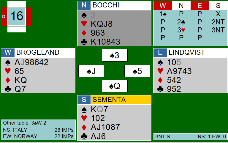 Dermed tre beit i kontrakten, og 150 inn til Norge. Sammen med 200 fra lukket rom utgjorde dette 8 tiltrengte IMP for Norge. Om spillefører hadde lasjert, hadde Espen vært inne på spar 10 uten mer spar å spille. Spillefører kunne i sin tur så vinne kontrakten om han fant kløver dame.