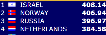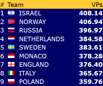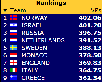 Før siste kamp har Norge 1,2 VP opp til ledende Israel, og ti poeng å gå på ned til Russland på tredjeplass.